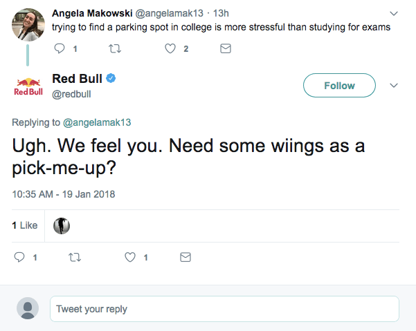 Don't you just love this? Red Bull, one of the biggest beverage companies in the world with a roster of famous people that we love, freely interacts with their customers. Social media can easily bridge the divide if customers perceive you to be too corporate.