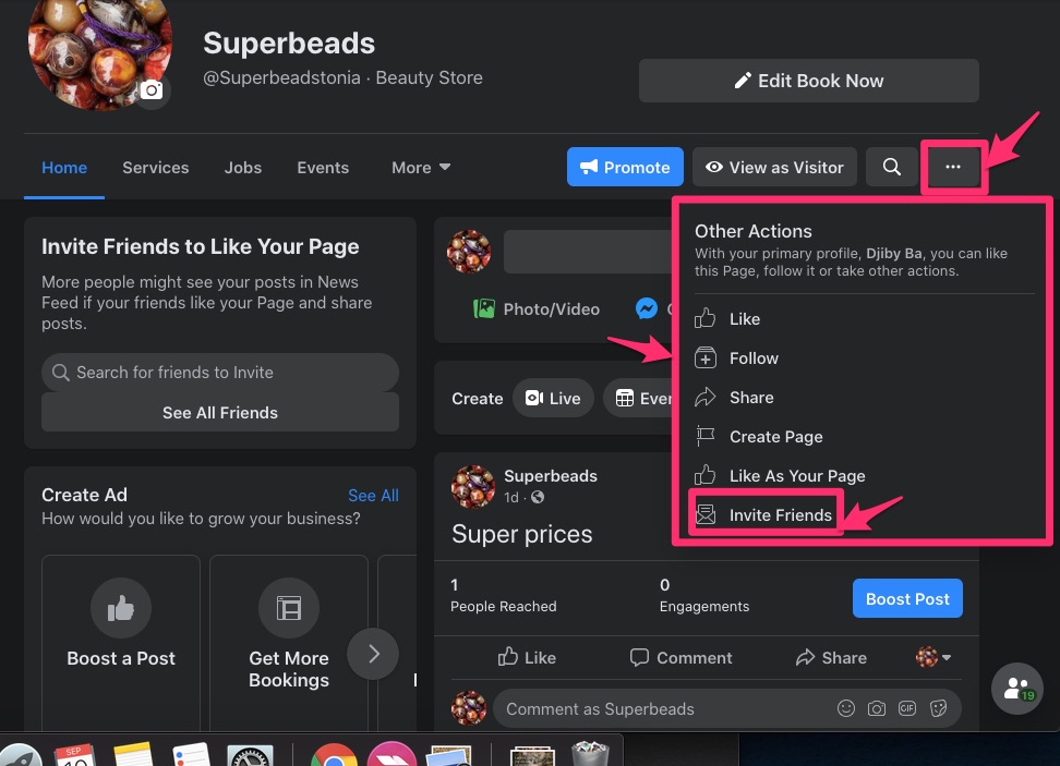 Another way is to click the three dots on your page’s top right and select “Invite Friends” from the drop-down menu.